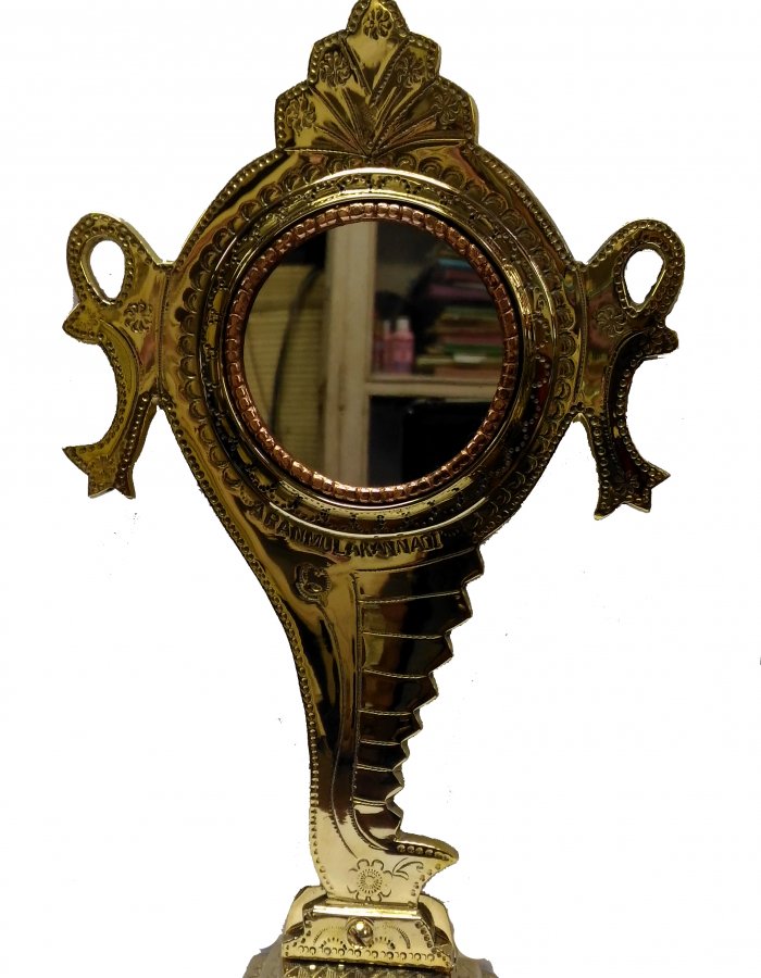 Aranmula kannadi, meaning the Aranmula mirror) is a handmade metal-alloy mirror, made in Aranmula, a small town in Pathanamthitta, Kerala, India. Unlike the normal ”silvered” glass mirrors, it is a metal-alloy mirror or first surface mirror or front surface reflection mirror, which eliminates secondary reflections and aberrations typical of back surface mirrors. The exact metals used in the alloy are maintained as a Vishwakarma family secret. Metallurgists suggest that the alloy is a mix of copper and tin . It is polished for several days to achieve the mirror’s reflective surface. They are considered to be one of the eight auspicious items or ”ashtamangalyam” that play a role in the entry of the bride at a wedding venue .