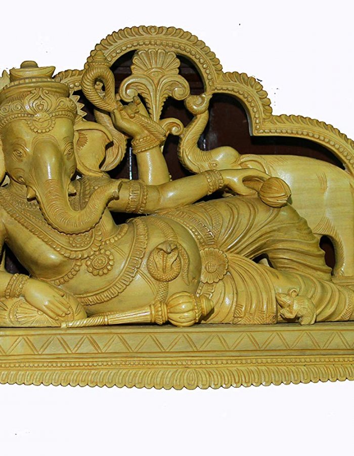 Lord Ganesh a lying on Peedam, carved in white wood Also known as Ganapati and Vinayaka, is one of the best-known and most worshipped deities in the Hindu pantheon. His image is found throughout India, Hindu sects worship him regardless of affiliations. Devotion to Ganesha is widely diffused and extends to Jains, Buddhists, and beyond India. Although he is known by many attributes, Ganesha’s elephant head makes him easy to identify. Ganesha is widely revered as the remover of obstacles, the patron of arts and sciences and the deva of intellect and wisdom. As the god of beginnings, he is honoured at the start of rituals and ceremonies.